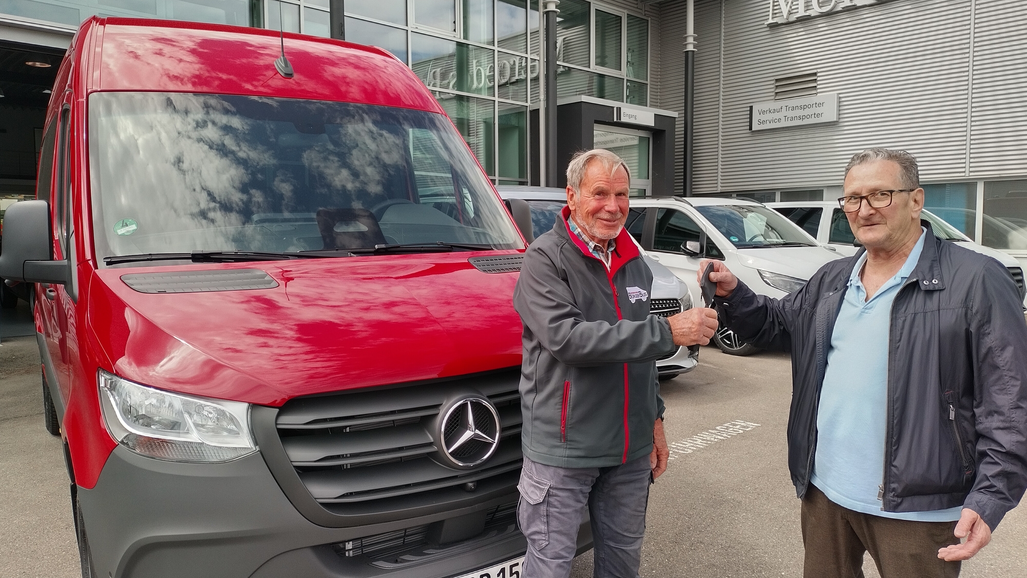 Das Bild zeigt den Bürgerbusfahrer Reinhard Schmidt (links) bei der Schlüsselübergabe im Autohaus durch Herrn Rusch von Mercedes-Benz.