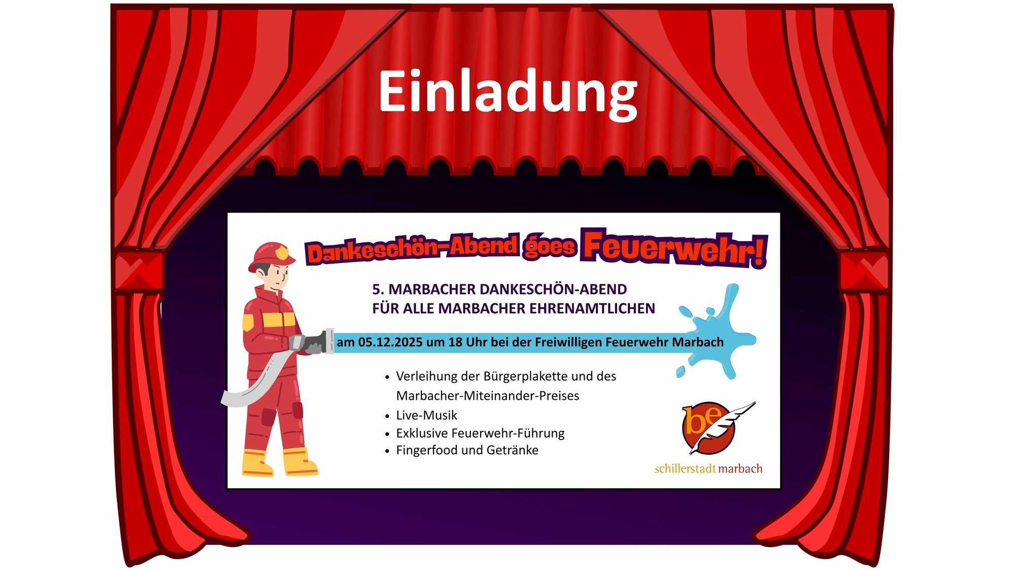 Am Freitag, den 5. Dezember 2025 gibt es wieder einen Dankeschön-Abend für alle Marbacher Ehrenamtlichen. Dieses Jahr feiern wir bei der Freiwilligen Feuerwehr Marbach.