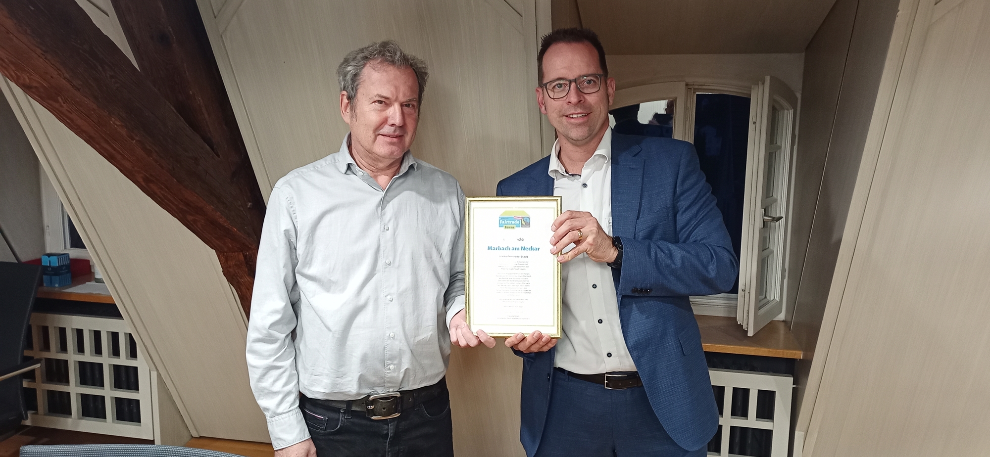 Die Stadt Marbach wurde in diesem Jahr erneut als Fairtrade-Stadt ausgezeichnet. Im Rahmen der Gemeinderatssitzung am 12. Oktober 2023 hat Bürgermeister Jan Trost die Urkunde an den Sprecher der Fairtrade-Steuerungsgruppe Jürgen Konzelmann übergeben.