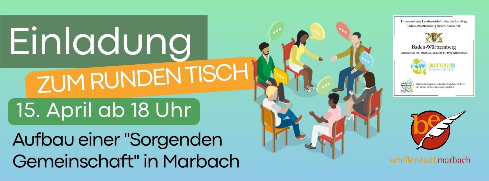 Das Projekt „Aufbau einer Sorgenden Gemeinschaft in Marbach“ kann umgesetzt werden dank finanzieller Mittel, die der Landtag von Baden-Württemberg beschlossen hat, und des hierfür erforderlichen Zuschusses durch die Stadt Marbach. Das Förderprogramm „Quartiersimpulse“ der Allianz für Beteiligung und des Ministeriums für Soziales, Gesundheit und Integration ist Teil der Landesstrategie „Quartier 2030 – Gemeinsam. Gestalten“.