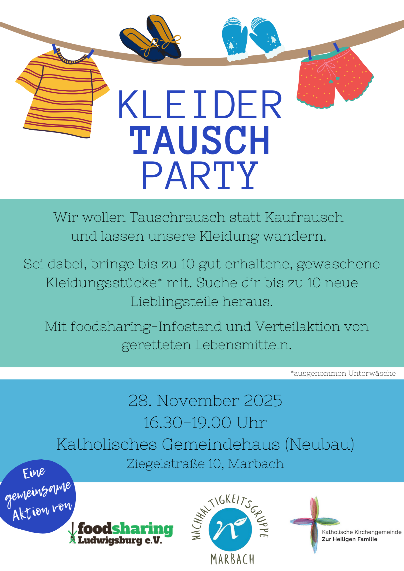 Am 28. November 2025 lädt die Marbacher Nachhaltigkeitsgruppe zusammen mit dem örtlichen foodsharing-Team zur Kleidertauschparty ein.